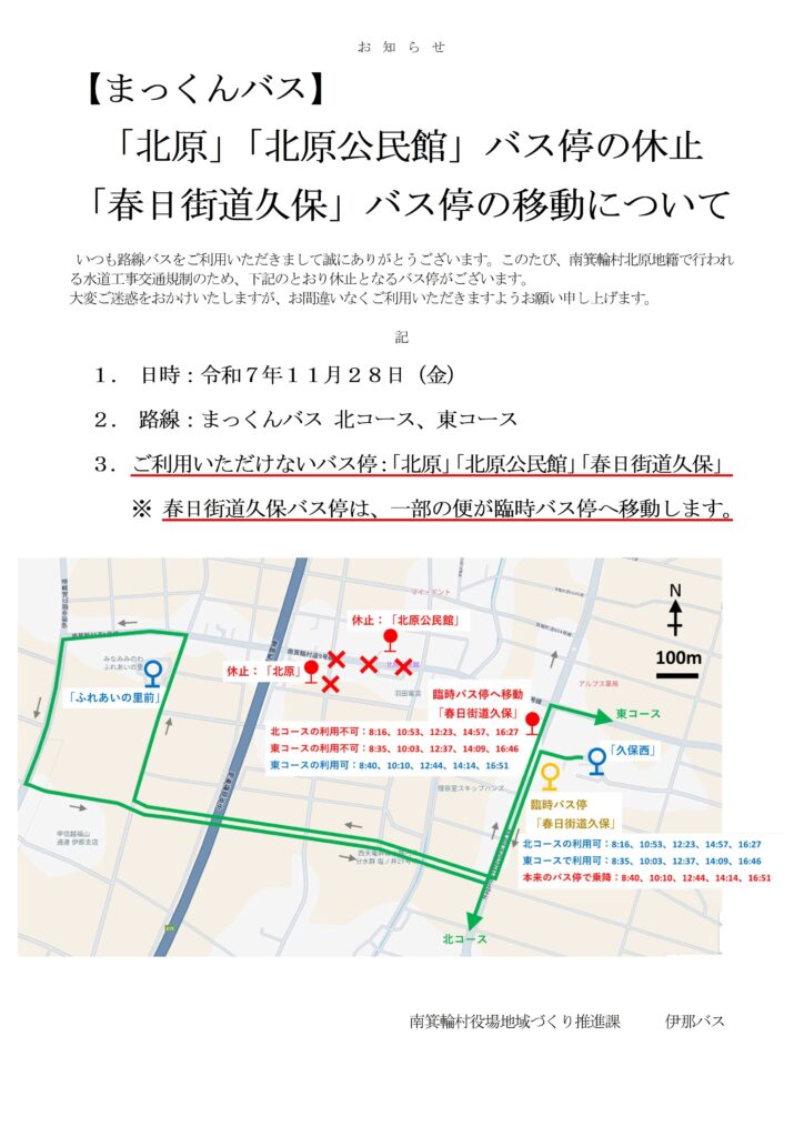 > (R7.11.28)【まっくんバス】「北原」「北原公民館」バス停の休止、「春日街道久保」バス停の移動について