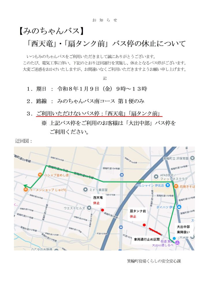 (R8.1.9)【みのちゃんバス】「西天竜」「扇タンク」バス停休止について