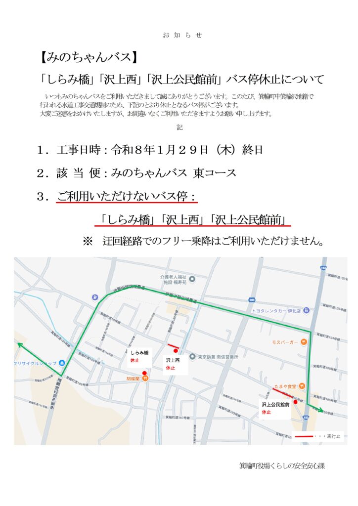 > (R8.1.29)【みのちゃんバス】「しらみ橋」「沢上西」「沢上公民館前」バス停休止について
