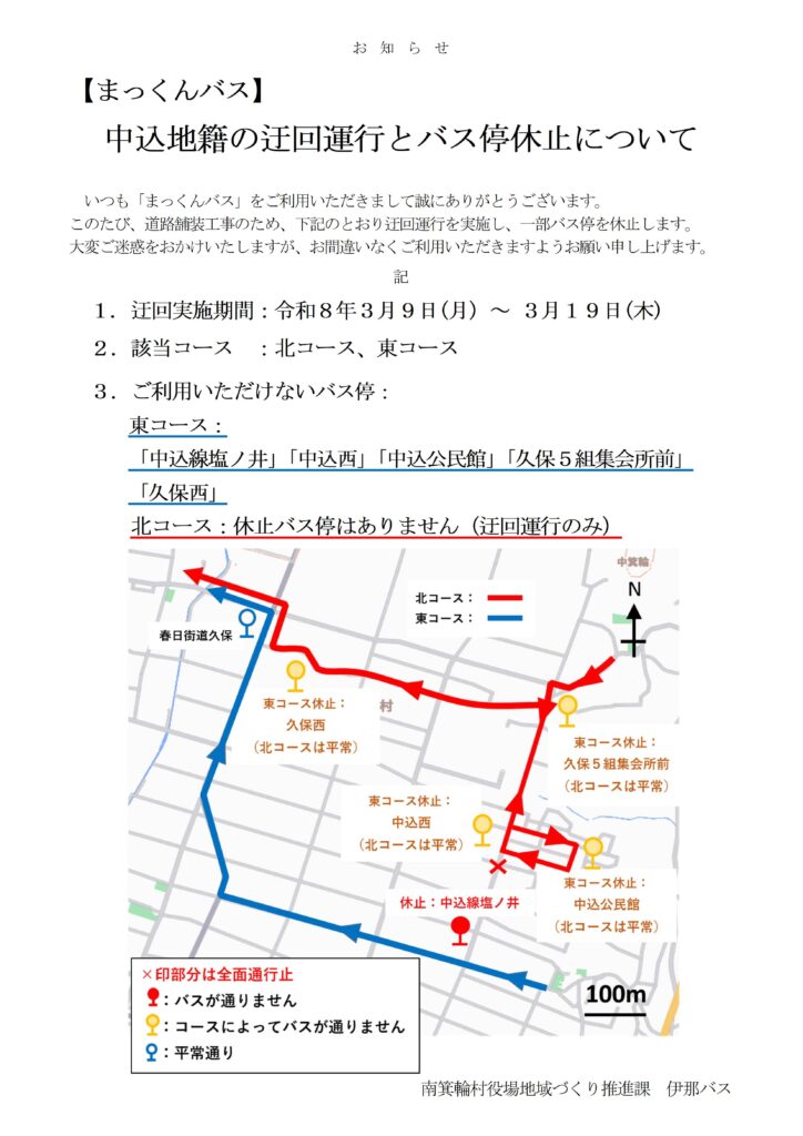 > (R8.3.9~19)【まっくんバス】東コース「中込線塩ノ井」「中込西」「中込公民館」「久保5組集会所前」「久保西」バス停休止について