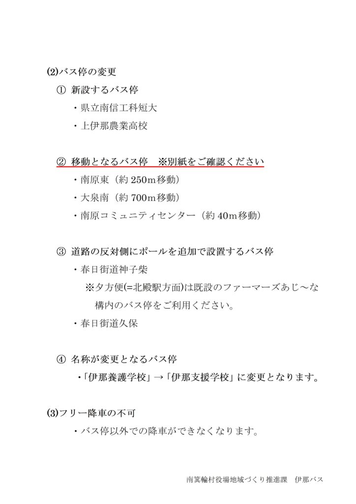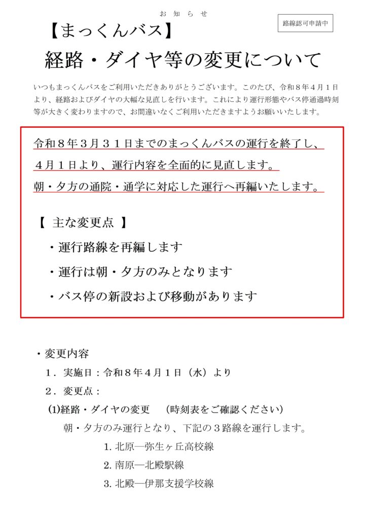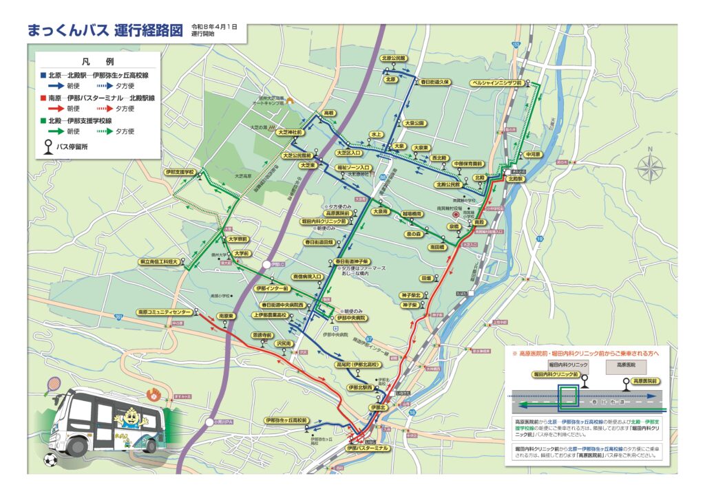高速バス 【まっくんバス】(R8.4.1)経路・ダイヤ等の変更について 新設するバス停について ・県立南信工科短大 について詳細はこちら ・上伊那農業高校 について詳細はこちら 移動するバス停について ・南原東 について詳細はこちら ・大泉南 について詳細はこちら 重要なお知らせ一覧へ戻る