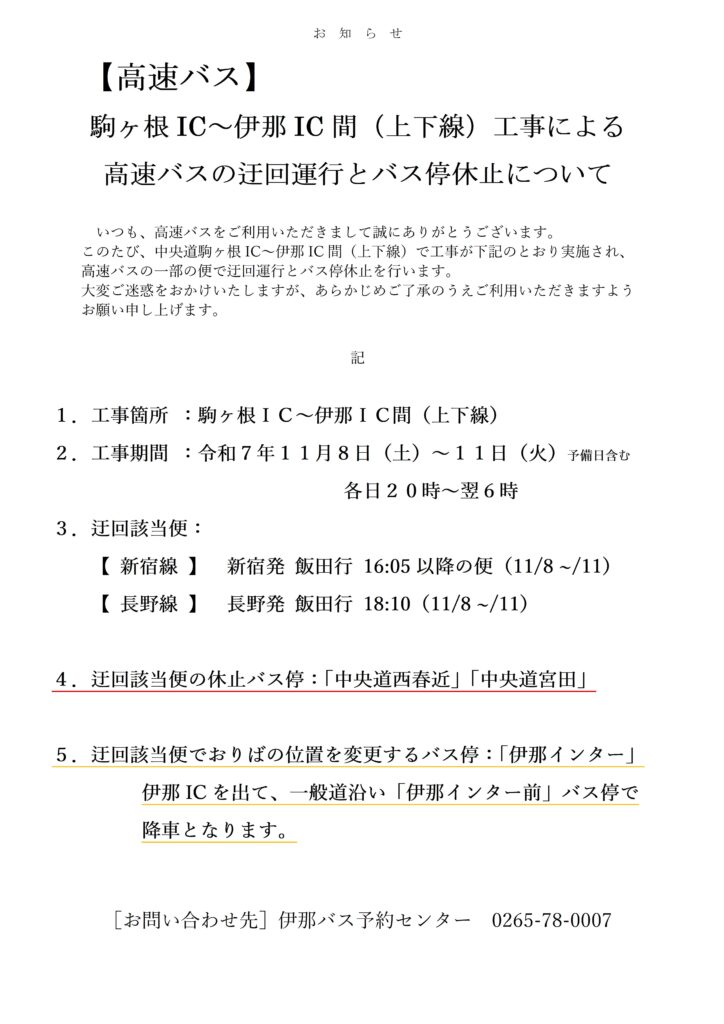 (R7.11.8~11)【高速バス】駒ヶ根IC-伊那IC間(上下線)の通行止のため、迂回とバス停休止について